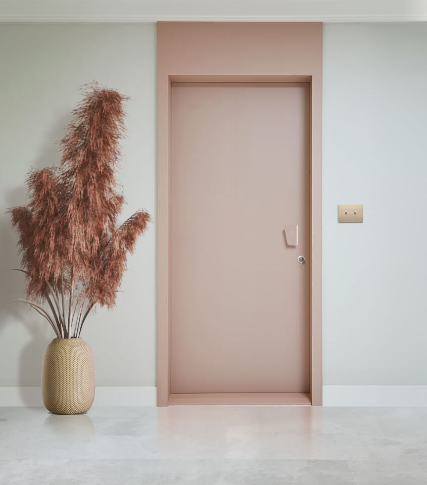 Un défi inattendu nous a été lancé : intégrer une porte CR3 dans un intérieur féminin, doux et reposant. Cette porte blindée, que l’on retrouve plus souvent dans un décor sombre et masculin, arbore ici d’une teinte beige minéral. Le résultat surprend par la douceur de ce ton pastel qui gomme toute rigidité. La robustesse de la structure s’efface derrière une couleur délicate, presque poudrée, qui capte la lumière et adoucit les lignes. Dans cette pièce zen, où dominent la clarté et le calme, la porte ne se contente pas de remplir sa fonction, elle devient un objet décoratif à part entière. Un résultat possible uniquement grace à notre maîtresse de la fabrication et au sur-mesure.